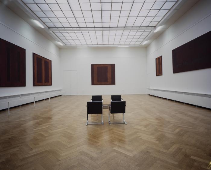 This exhibition drew its name from a pilgrimage site, the cube-shaped structure at Mecca’s center, and took as its focus the murals Rothko produced in 1958–1959 for the Four Seasons Restaurant in the Seagram Building, New York. The artist painted about thirty large canvases from which he would have made a final selection and sequence had he not abandoned the commission in 1959. Rothko gave a set of nine of the paintings to the Tate Gallery in 1969, intending them to be displayed together in a particular sequence in a preselected gallery. Mark Rothko: Kaaba in New York included all of the Tate murals, as well as a set of seven murals that had been acquired just prior to the 1990 opening of the Kawamura Museum in Japan. Ten related canvases were lent by the National Gallery of Art and private collections, including the Rothko family. Seven construction-paper studies were shown, as were two long horizontal canvases presumed to date from the Seagram project but later found to be from 1963. Mark Rothko: Kaaba in New York was curated by Thomas Kellein, then director of the Kunsthalle Basel.
